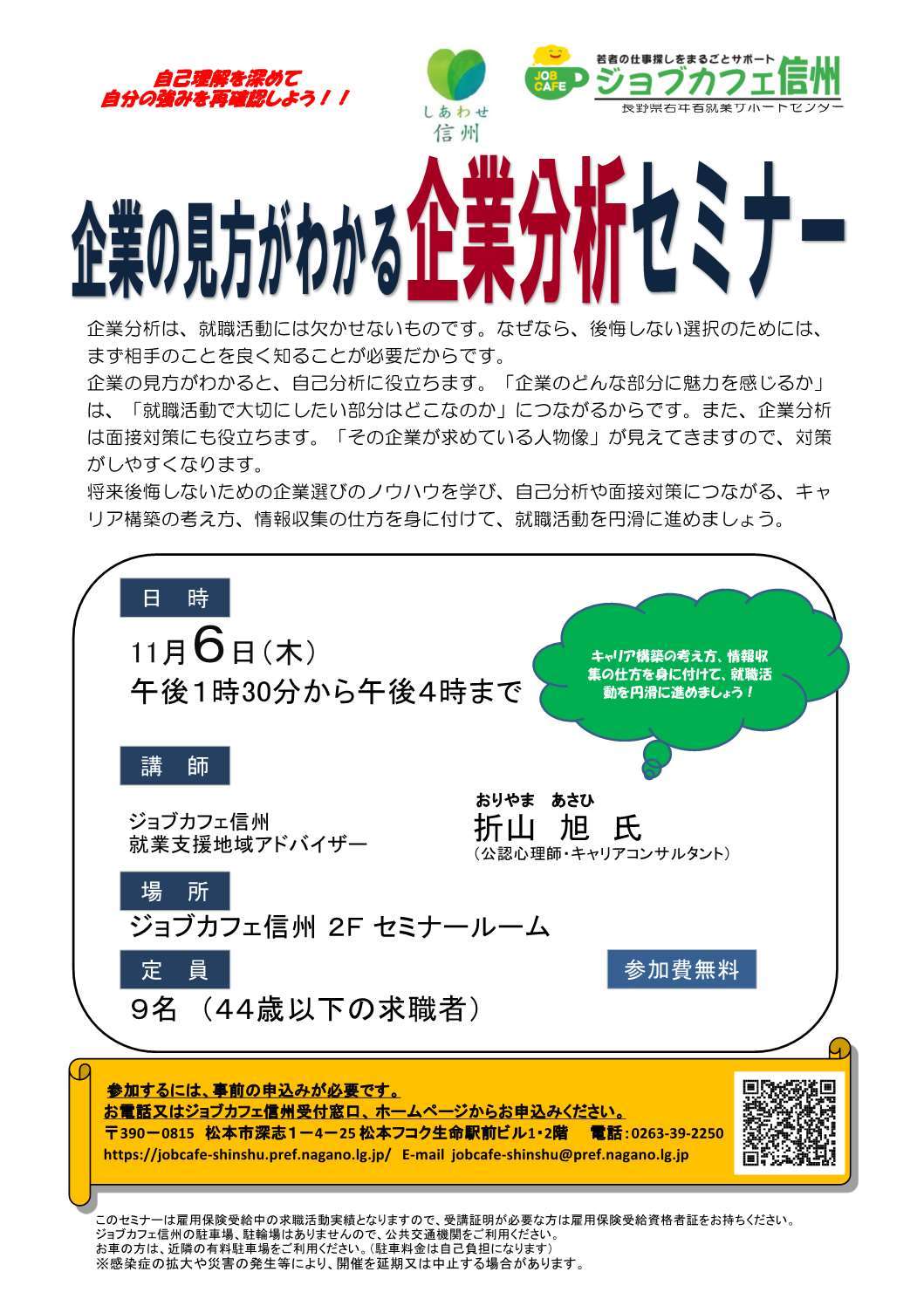備考 | このセミナーは雇用保険受給中の求職活動実績となりますので、受講証明が必要な方は雇用保険受給資格者証をお持ちください。 ジョブカフェ信州の駐車場、駐輪場はありませんので、公共交通機関をご利用ください。 お車の方は、近隣の有料駐車場をご利用ください。(駐車料金は自己負担になります) ※新型コロナウイルス感染症などの感染症の拡大状況により、開催を延期又は中止する場合があります。 |