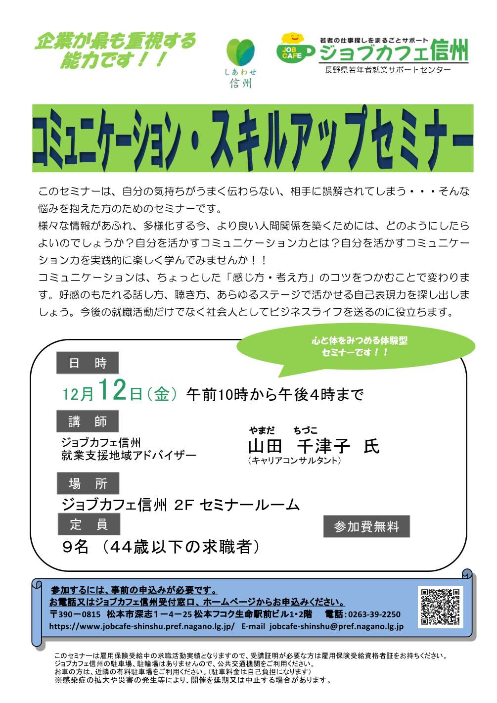 ジョブカフェ信州 セミナールーム 松本市深志1-4-25 松本フコク生命駅前ビル2階 |