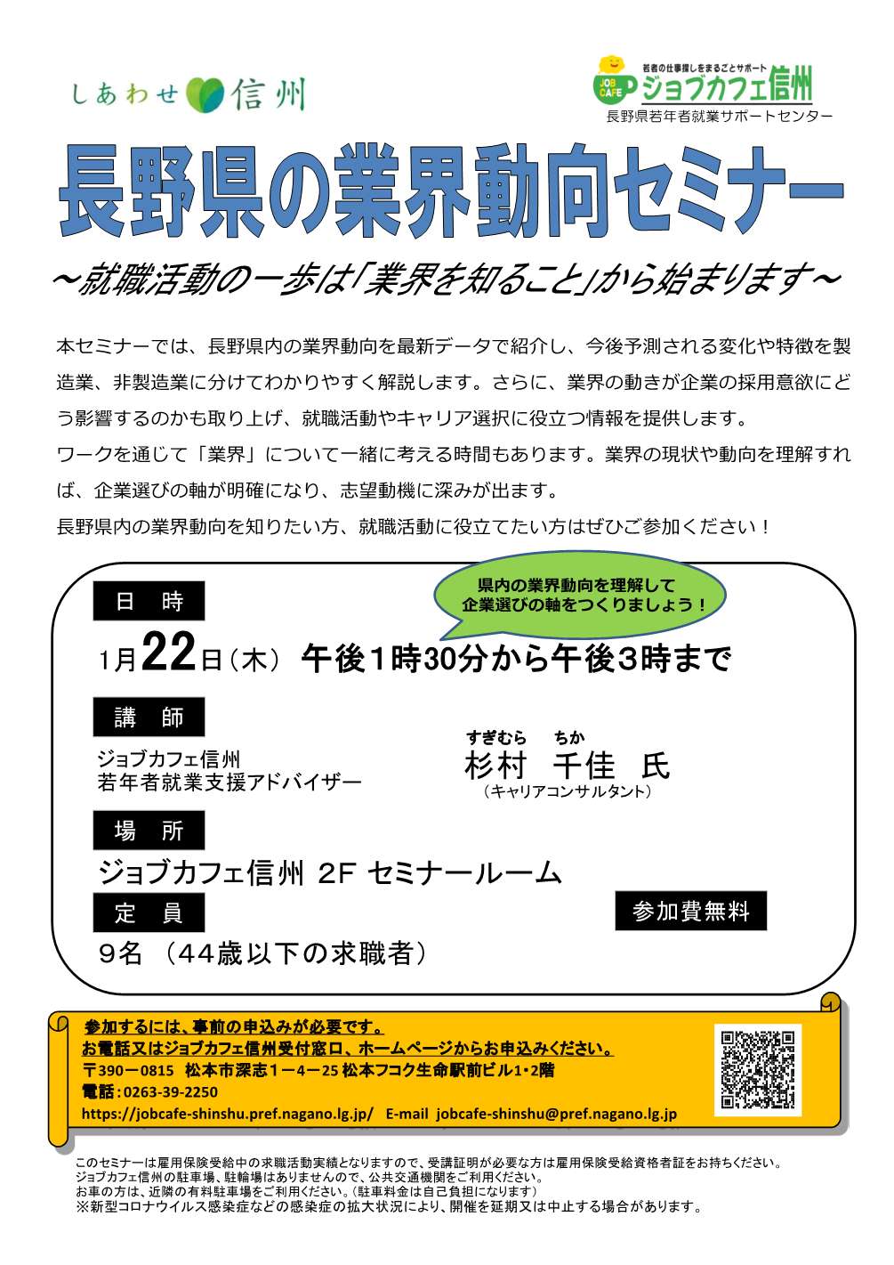 | 備考 | 参加するには、事前の申込みが必要です。 お電話又 はジョブカフェ 信州受付窓口 、 ホームページからお 申込 みください 。 このセミナーは雇用保険受給中の求職活動実績となりますので、受講証明が必要な方は雇用保険受給資格者証をお持ちください。 ジョブカフェ信州の駐車場、駐輪場はありませんので、公共交通機関をご利用ください。 お車の方は、近隣の有料駐車場をご利用ください。(駐車料金は自己負担になります) ※感染症の拡大や災害の発生等により、開催を延期又は中止する場合があります。 |
