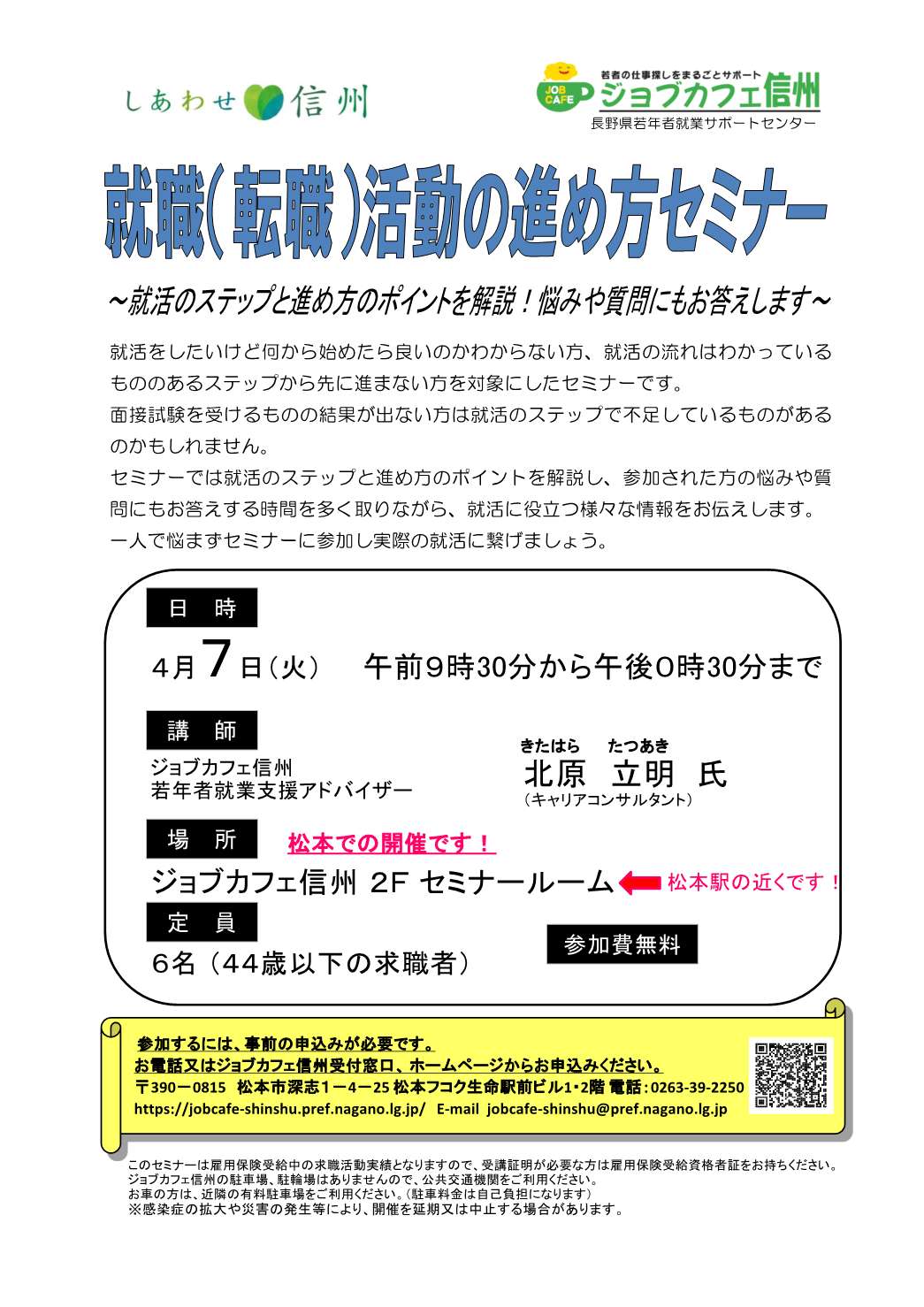 | 備考 | 参加するには、事前の申込みが必要です。 お電話又はジョブカフェ信州受付窓口、ホームページからお申込みください。 このセミナーは雇用保険受給中の求職活動実績となりますので、受講証明が必要な方は雇用保険受給資格者証をお持ちください。 ジョブカフェ信州の駐車場、駐輪場はありませんので、公共交通機関をご利用ください。 お車の方は、近隣の有料駐車場をご利用ください。(駐車料金は自己負担になります) ※感染症の拡大や災害の発生等により、開催を延期又は中止する場合があります。 |