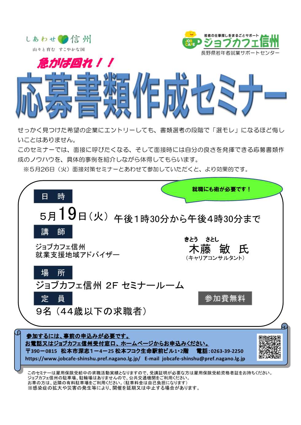 | 備考 | 参加するには、事前の申込みが必要です。 お電話又 はジョブカフェ 信州受付窓口 、 ホームページからお 申込 みください 。 このセミナーは雇用保険受給中の求職活動実績となりますので、受講証明が必要な方は雇用保険受給資格者証をお持ちください。 ジョブカフェ信州の駐車場、駐輪場はありませんので、公共交通機関をご利用ください。 お車の方は、近隣の有料駐車場をご利用ください。(駐車料金は自己負担になります) ※感染症の拡大や災害の発生等により、開催を延期又は中止する場合があります。 |